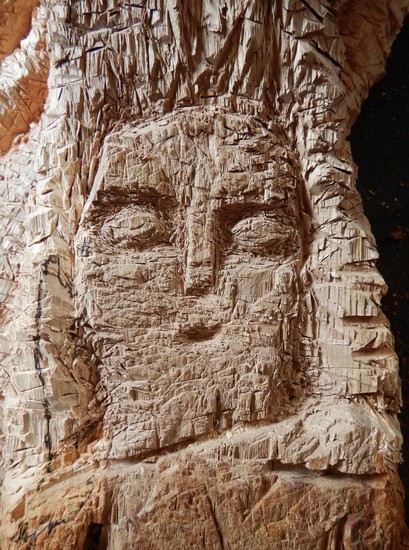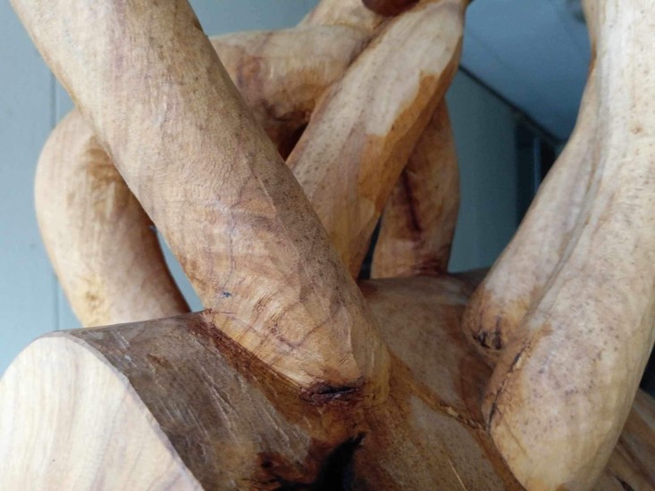 *原木や廃材を手斧1本で彫り刻み、具象抽象にとらわれず、ダイナミックな生命エネルギーを形にし続けている。
